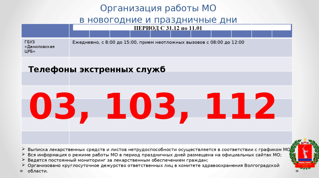 Уважаемые жители Даниловского района, сообщаем вам, что для участников специальной военной операции в поликлинике ГБУЗ «Даниловская ЦРБ» ежедневно с 8.00 до 10.00 установлены часы приема для оказания медицинской помощи, в том числе в рамках диспансеризации, вне общей очереди.